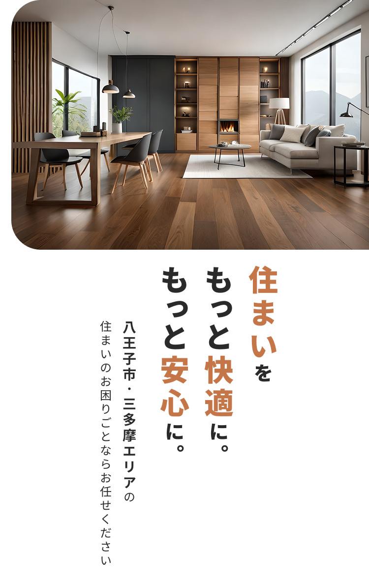 株式会社 ReLIFEでは、八王子市・三多摩エリアを中心に、内装工事・リフォーム・リノベーション・外壁塗装・屋根工事まで幅広く対応しています。地域密着ならではの迅速対応と、現地調査から施工完了まで一貫したサポートで、安心の住まいづくりをご提供します。地域を熟知したスタッフが在籍しているからこそ、住環境や建物の特性を踏まえた最適なご提案が可能です。
