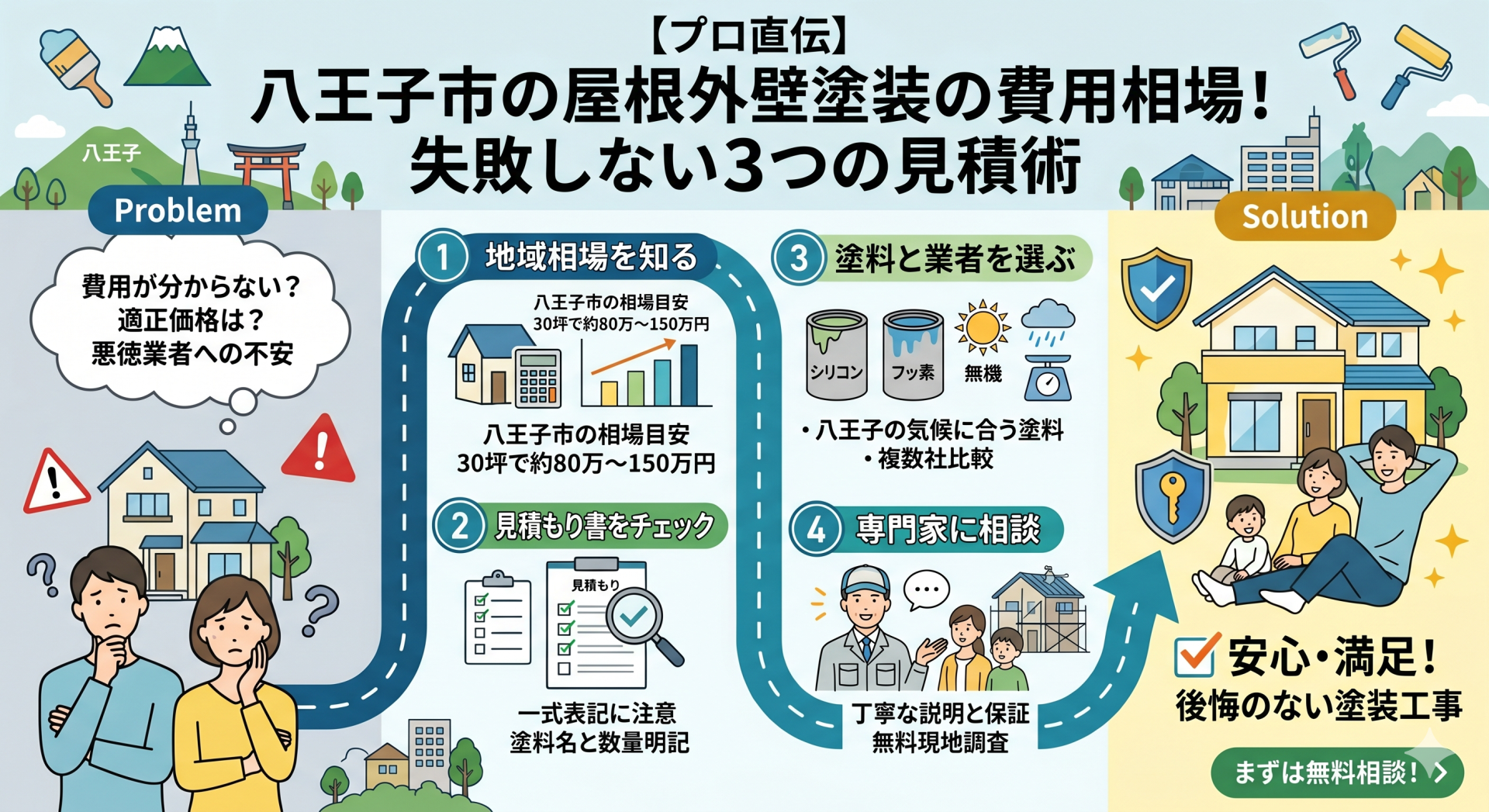 八王子市の厳しい気候から大切な住まいを守るためには、建物の現在の状態を正確に把握し、それに適した塗料と適正な価格で工事を行うことが不可欠です。本記事でご紹介した知識が、皆様の失敗しない塗装工事の一助となれば幸いです。